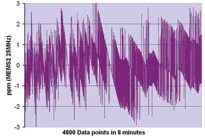 BAW振蕩器的圖表(此處不再列出,但在完整研究報(bào)告中可找到)為大多數(shù)人所熟知。對(duì)于相同的測試,典型的BAW振蕩器偏差低于±0.02ppm,這樣會(huì)在零偏差圖表線處形成一條直線。