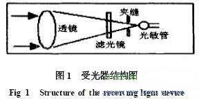 光電傳感器以光為媒介進(jìn)行無(wú)接觸檢測(cè)。光是一種頻率很高的電磁波[1]。光干擾也算是一種電磁干擾,光干擾是傳感器誤動(dòng)作的主要因素之一。環(huán)境光、背景光和周圍其它光電傳感器發(fā)出的光是光干擾源。以紅外線為媒介進(jìn)行檢測(cè)則可減小可見(jiàn)光的影響,紅外光也不影響可見(jiàn)光。紅外線光電傳感器可用濾光鏡濾去可見(jiàn)光。對(duì)于周圍環(huán)境其它光電傳感器的光干擾,可用外殼、套筒、夾縫來(lái)抑制[2]。圖1是一種受光器結(jié)構(gòu)圖。