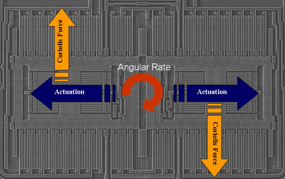 - 感應部分通過測量電容變化來測量科里奧利力在感應質點上產生的位移,這是一個穩(wěn)健、可靠的技術,被成功地用于ST的MEMS產品線,能夠提供強度與施加在傳感器上的角速率成正比的模擬或數(shù)字信號。