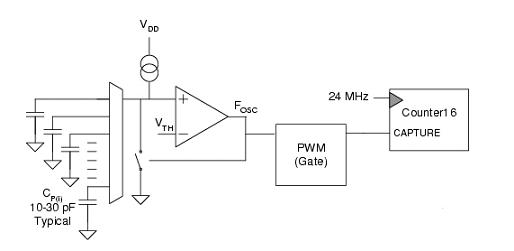 該比較器的輸出被作為一個(gè)脈沖寬度調(diào)制器(PWM)電路的時(shí)鐘輸入信號,它負(fù)責(zé)選通一個(gè)頻率為24兆赫茲的16位計(jì)數(shù)器。手指接觸傳感器時(shí)會(huì)增加電容,從而增加計(jì)數(shù)器的總值。這就是一個(gè)手指如何被感覺到方式。這個(gè)系統(tǒng)的典型波形如圖4所示
