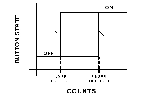 該轉(zhuǎn)移函數(shù)中的遲滯提供了開關(guān)狀態(tài)之間的干凈利落的轉(zhuǎn)換,即使計(jì)數(shù)是有噪聲的情況下也不例外。這也為按鍵提供了一種反跳功能。低門限被稱為“噪聲門限”,而高門限則被稱為“手指門限”。門限水平的設(shè)定決定了系統(tǒng)的性能。當(dāng)覆蓋層非常厚時(shí),信噪比很低。在此類系統(tǒng)中設(shè)定門限水平是一項(xiàng)具有挑戰(zhàn)性的工作,而這恰好是電容式傳感設(shè)計(jì)技巧的一部分。