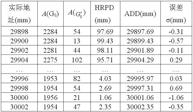 實(shí)驗方法:在編碼電纜任找一處反復(fù)移動天線箱,直至檢測到A(G''0)為最小,此時顯示地址為29.000m,以此處作為實(shí)際的29.000m。然后將天線箱在此附近每隔2mm移動一次,記錄每次所檢測的A(G0)和A(G''0),并根據(jù)檢測的數(shù)據(jù)計算出位置數(shù)據(jù):HRPD、ADD。同理,在30.000m處作同樣測試。部分檢測數(shù)據(jù)和計算結(jié)果如表1所示.