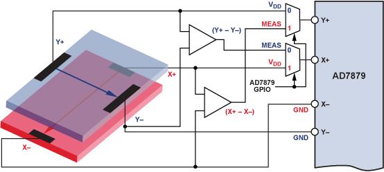 在前半周期中,將一個(gè)直流電壓施加于上層(有源層),并測(cè)量X+引腳的電壓(對(duì)應(yīng)于VY+ – VY–),以提供與Y方向上的運(yùn)動(dòng)(接近還是分開)相關(guān)的信息。
