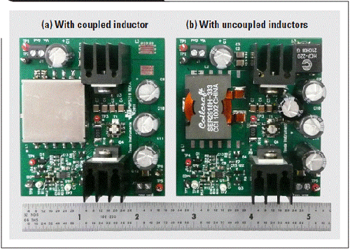 “表 1”所示規(guī)范為設計比較的基礎。第一個設計使用一個耦合電感,而第二個則使用兩個非耦合電感。