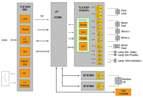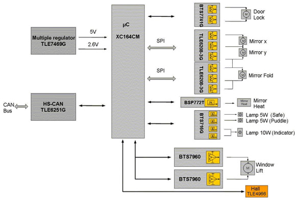 TLE8201R的另外一個重要特性是嵌入式標準串行外設接口(SPI)。SPI不僅可以節(jié)省微控制器的I/O管腳數量,而且能夠靈活控制功率電路,通過錯誤標志快速進行詳細的故障診斷。這種診斷功能包括對每個單獨通道進行過載或負載開路檢測,對整個器件進行溫度預警及電流檢測輸出。還有各種保護功能,如短路和過溫保護。兩個直接PWM通道可以用來實現諸如“軟”啟動/停止后視鏡加熱、車內照明的劇院燈光效果或在控制面板背光燈應用中補償LED亮度等級等功能。采用的DSO-36封裝包含了具有較低熱阻的全尺寸散熱片,可確保模塊在正常條件甚至最壞環(huán)境下正常工作。圖3是采用TLE8201R的一個車門模塊設計例子。