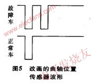 有無波形可得出圖5中的2個波形,ECU只有得到圖5下圖波形才能發(fā)出點火信號起動發(fā)動機,而ECU得到圖5上的波形不能發(fā)出點火信號起動發(fā)動機,但在偶然的時刻故障位置產(chǎn)生的波形恰好達(dá)到合格的底線時,就可以起動發(fā)動機。起動后,ECU對曲軸位置傳感器波形的檢測就不是那么嚴(yán)了,因此,發(fā)動機起動后不會熄火。也就是此車故障的根本原因。