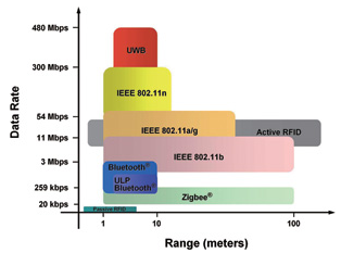 根據(jù)不同的頻率、目標(biāo)數(shù)據(jù)速率、距離,以及互操作性的理想水平,新出現(xiàn)了幾種工作在ISM頻率空間中的標(biāo)準(zhǔn)。圖1顯示了無線工程師進(jìn)行產(chǎn)品開發(fā)時(shí)最常使用的一些標(biāo)準(zhǔn)。