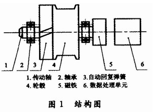 基于磁敏角度技術(shù)的拉線式位移傳感器的功能是將拉線的機(jī)械位移換成可以計(jì)量、記錄或傳送的電信號(hào),主要由自動(dòng)回復(fù)彈簧、輪轂、磁鐵以及數(shù)據(jù)處理單元等部分構(gòu)成,結(jié)構(gòu)如圖1所示。