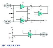 正如上述所說,ECG的信號路徑必須能調(diào)理不同來源的噪聲。對抗直流電噪聲,可以使用高通濾波器。然而,最令人頭痛的是50Hz的噪聲,因為它剛好與我們收集的信號頻率處于相同范圍。要消除這個共模噪聲,需要建立一個測量儀表放大器。這個配置之所以很理想是因為它可在抑制共模電壓的同時放大有用的差分信號,這利于把微弱的有效信號從背景噪聲中分隔出來。正如圖2所示,這個儀表放大器是用LMP2234(四通道、微功率、高精度的RRO運算放大器)和高精度的電阻器(0.1%)實現(xiàn)出來?! ?br />