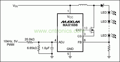 圖6. 基于MAX1698的LED亮度調(diào)節(jié)器