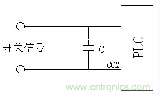 有時PLC或其它控制器的開關量輸入由于受外界干擾影響而瞬間輸入錯誤,導致PLC產生誤動作,這時在PLC的輸入端并上一個0.1uF的小電容就可以消除這種干擾,如下圖所示: