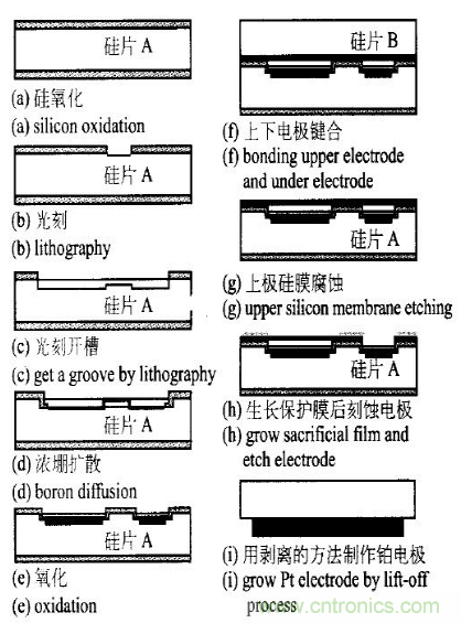 高溫壓力傳感器由硅膜片、襯底、下電極和絕緣層構(gòu)成。其中下電極位于厚支撐的襯底上。電極上蒸鍍一層絕緣層。硅膜片則是利用各向異性腐蝕技術(shù),在一片硅片上從正反面腐蝕形成的。上下電極的間隙由硅片的腐蝕深度決定。硅膜片和襯底利用鍵合技術(shù)鍵合在一起,形成具有一定穩(wěn)定性的硅膜片電容壓力傳感器[2] 。由于鉑電阻耐高溫,且對(duì)溫度敏感,選用鉑電阻,既可以當(dāng)普通電阻使用,又可以作為溫度傳感器用以探測(cè)被測(cè)環(huán)境的溫度。金屬鉑電阻和硅膜片的參數(shù)為:0 ℃時(shí)鉑電阻值為1 000Ω;電阻率為1. 052 631 6 ×10 - 5Ω?cm;密度為21 440 kg/ m3 ;比熱為132. 51 J/ (kg?K) 、熔斷溫度為1 769 ℃,故鉑電阻可加工為寬度為0. 02 mm;厚度為0. 2μm;總長(zhǎng)度為3 800μm,制作成鋸齒狀,可在幅值為10 V 的階躍信號(hào)下正常工作。電容式壓力傳感器的上下電極的間隙為3μm、圓形平板電容上下電極的半徑為73μm、其電容值為50 pF。具體工藝流程圖如圖1所示。