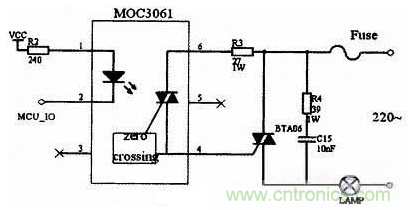 本系統(tǒng)由光電傳感器檢測洗手間內(nèi)是否有人,單片機進行計數(shù),當N不為零時,單片機會向與MOC3061芯片引腳相連的端口輸送信號,然后通過可控硅來控制燈的開、關(guān)。其中R3是雙向可控硅的門極電阻,當可控硅靈敏度較高時,門極阻抗也很高,并上R3可提高抗干擾能力。 39Ω電阻和0.01μF電容組成浪涌吸收電路,防止浪涌電壓損壞雙向可控硅。其電路圖如圖4所示。
