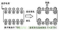 當一些晶體受熱時,在晶體兩端將會產生數(shù)量相等而符號相反的電荷,這種由于熱變化產生的電極化現(xiàn)象,被稱為熱釋電效應。通常,晶體自發(fā)極化所產生的束縛電荷被來自空氣中附著在晶體表面的自由電子所中和,其自發(fā)極化電矩不能表現(xiàn)出來。當溫度變化時,晶體結構中的正負電荷重心相對移位,自發(fā)極化發(fā)生變化,晶體表面就會產生電荷耗盡,電荷耗盡的狀況正比于極化程度,圖1表示了熱釋電效應形成的原理。