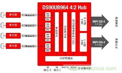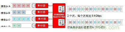 圖3所示為四攝像頭系統(tǒng),具有由彩色塊所示的不同數(shù)據(jù)速率。聚合數(shù)據(jù)在移動(dòng)工業(yè)處理器接口(MIPI)攝像頭串行接口(CSI)-2端口0和1兩者處呈現(xiàn)。CSI-2總線具有“突發(fā)性”,意味著其以固定數(shù)據(jù)速率運(yùn)行、將發(fā)送數(shù)據(jù)為可用狀態(tài),并且當(dāng)機(jī)器空閑時(shí)恢復(fù)到低功率(LP)狀態(tài)。因此,傳感器速度可在不改變ECU處理器時(shí)序的條件下進(jìn)行變化。即使傳感器鏈路以獨(dú)立頻率運(yùn)行,解串器集線器在單個(gè)參考時(shí)鐘上也可將數(shù)據(jù)提供給片上系統(tǒng)(SoC)處理器,從而簡(jiǎn)化系統(tǒng)時(shí)序。