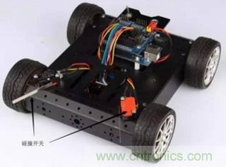 在機(jī)器人比賽中,碰撞開關(guān)經(jīng)常被用在碰撞壁障小車上(見圖3)。小車前端的碰撞開關(guān)在碰撞到障礙物時(shí)就會(huì)給控制器反饋一個(gè)信號(hào),告訴控制器前方左側(cè)或右側(cè)有障礙物,程序再控制小車轉(zhuǎn)彎避開障礙物。
