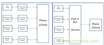 無線傳感器網(wǎng)絡通常作為網(wǎng)狀網(wǎng)絡和樞紐網(wǎng)絡(見圖1)。樞紐網(wǎng)絡包括可以放置在相同位置的所有傳感器。每個傳感器需要連接到單個BLE外圍設備(服務器)來處理數(shù)據(jù)并將其發(fā)送到BLE中央設備(客戶端)。網(wǎng)狀網(wǎng)絡采用可以遠程定位傳感器的拓撲結構。網(wǎng)格中的每個節(jié)點都需要連接到BLE外圍設備(服務器),所有這些外圍設備都可以連接到BLE中央設備(客戶端)。