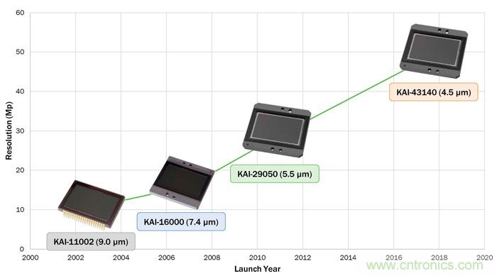 Interline Transfer CCD技術(shù)用于開(kāi)發(fā)高分辨率、大格式圖像傳感器已超過(guò)15年,其分辨率隨市場(chǎng)需要逐漸提高。例如,2003年的KAI-11000圖像傳感器以35 mm光學(xué)格式提供1100萬(wàn)像素的分辨率;但到2011年,這種相同的光學(xué)格式幾乎可支持三倍的分辨率。
