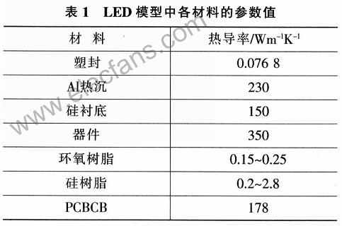 討論在現(xiàn)有結(jié)構(gòu)、LED封裝及熱沉材料熱導(dǎo)率等因素變化對(duì)于其最大功率的影響,尋找影響LED散熱的關(guān)鍵因素。研究方法為有限元熱分析法.該方法已有實(shí)驗(yàn)驗(yàn)證了LED有限元模型與其真實(shí)器件之間的差別,證明其在誤差許可范圍內(nèi)是準(zhǔn)確可行的。